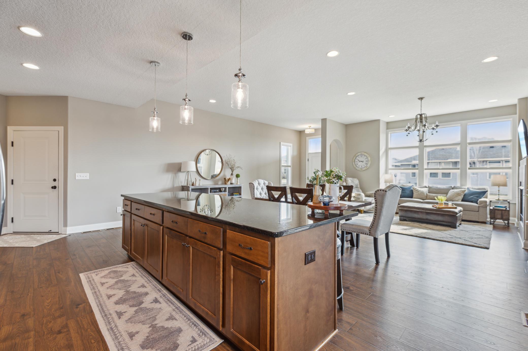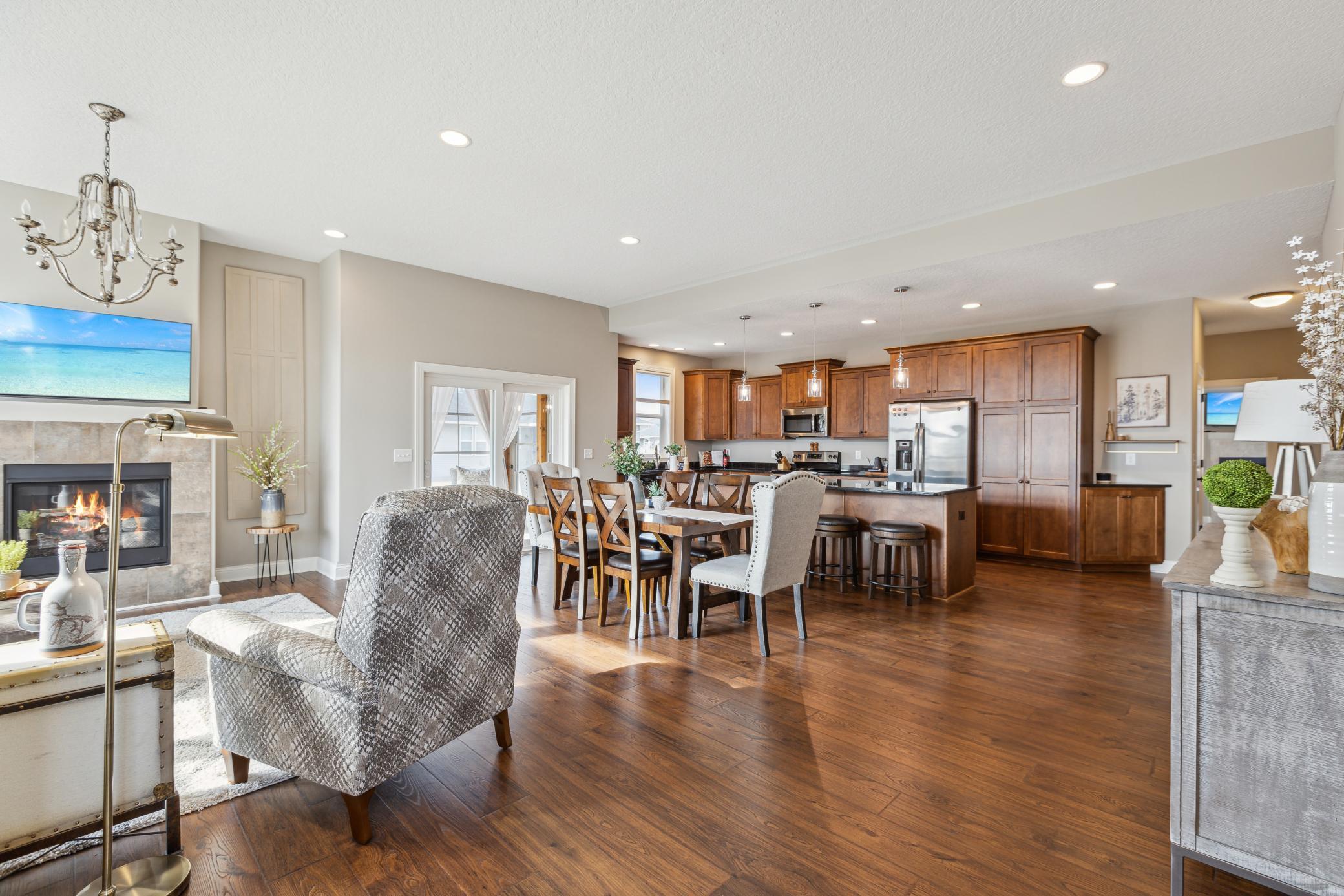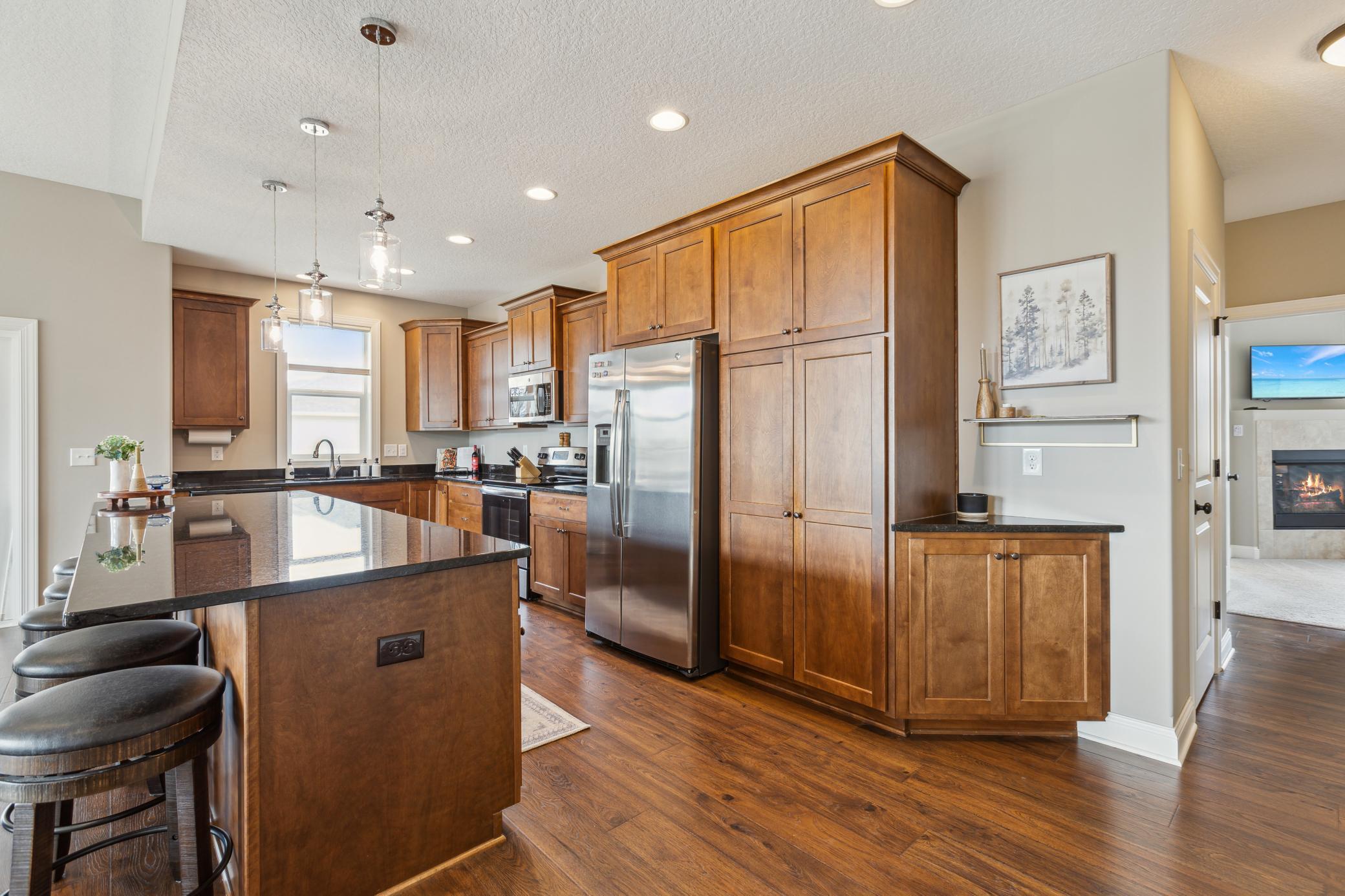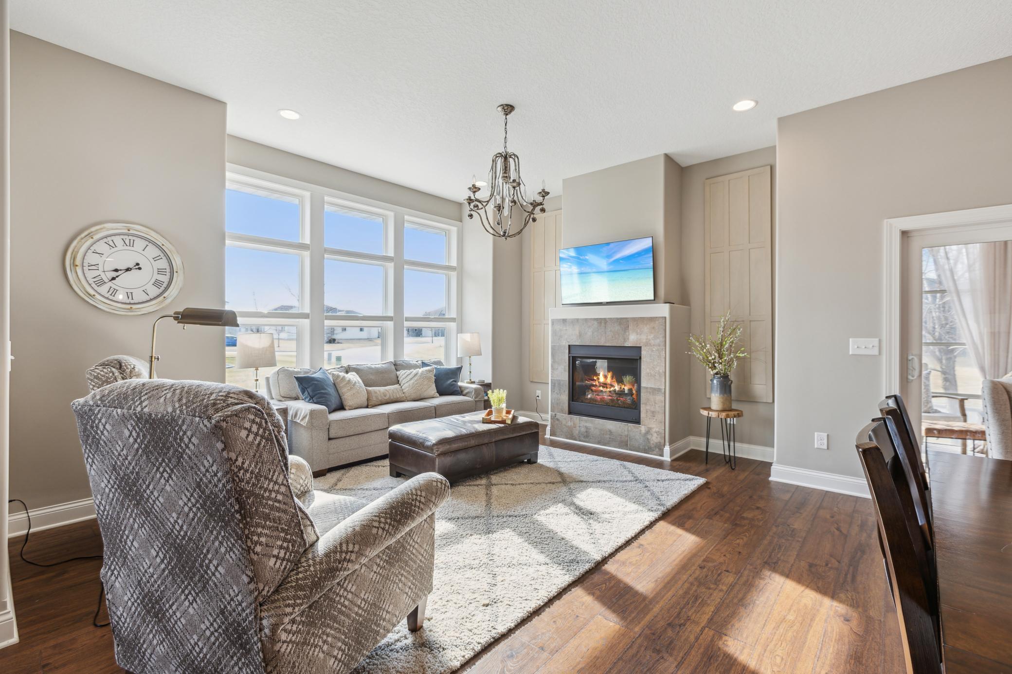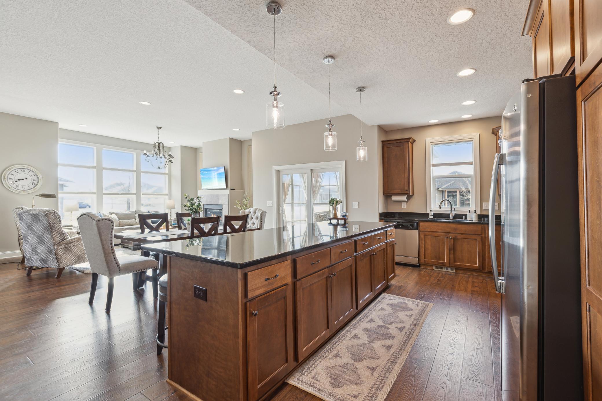 This beautifully designed home offers a stunning kitchen featuring granite countertops, stainless steel appliances, and a center island with a breakfast bar, perfect for entertaining. Walls of windows flood the open-concept living space with natural light, while the cozy fireplace in the living room creates a warm and inviting atmosphere.