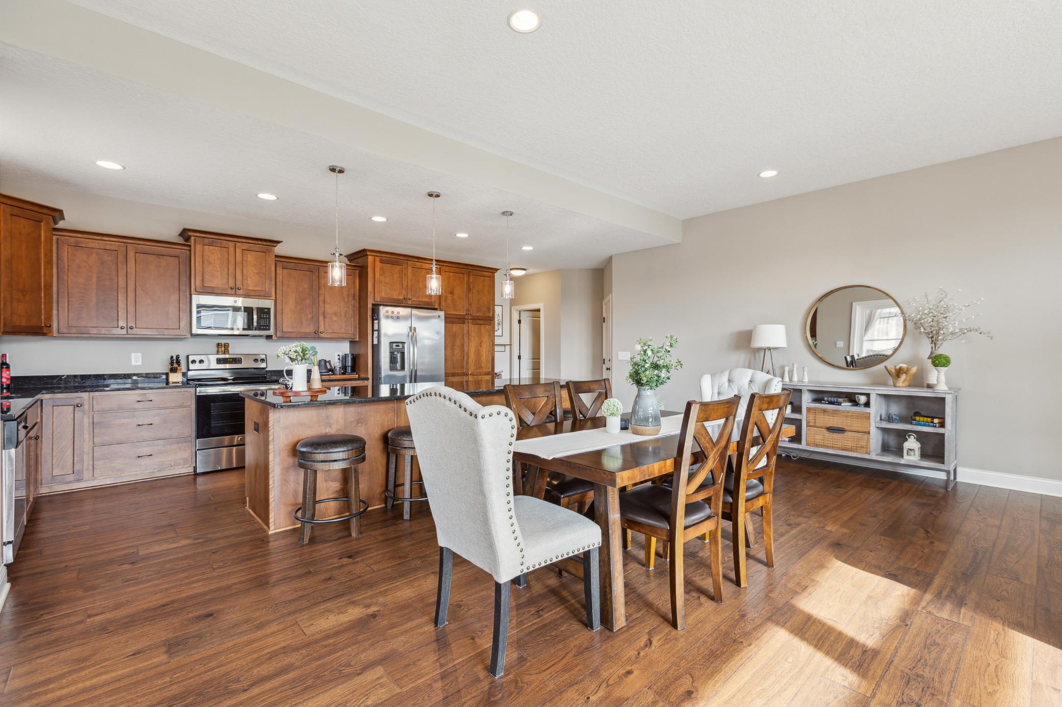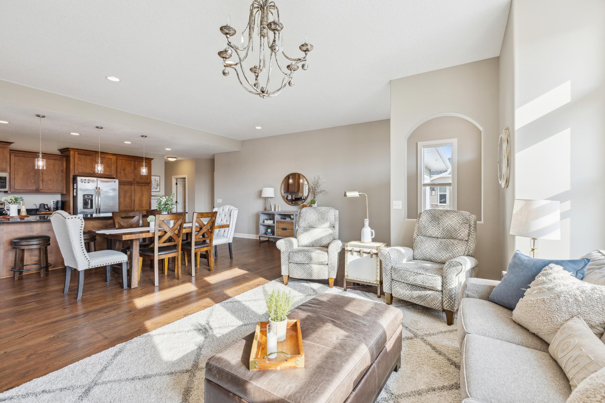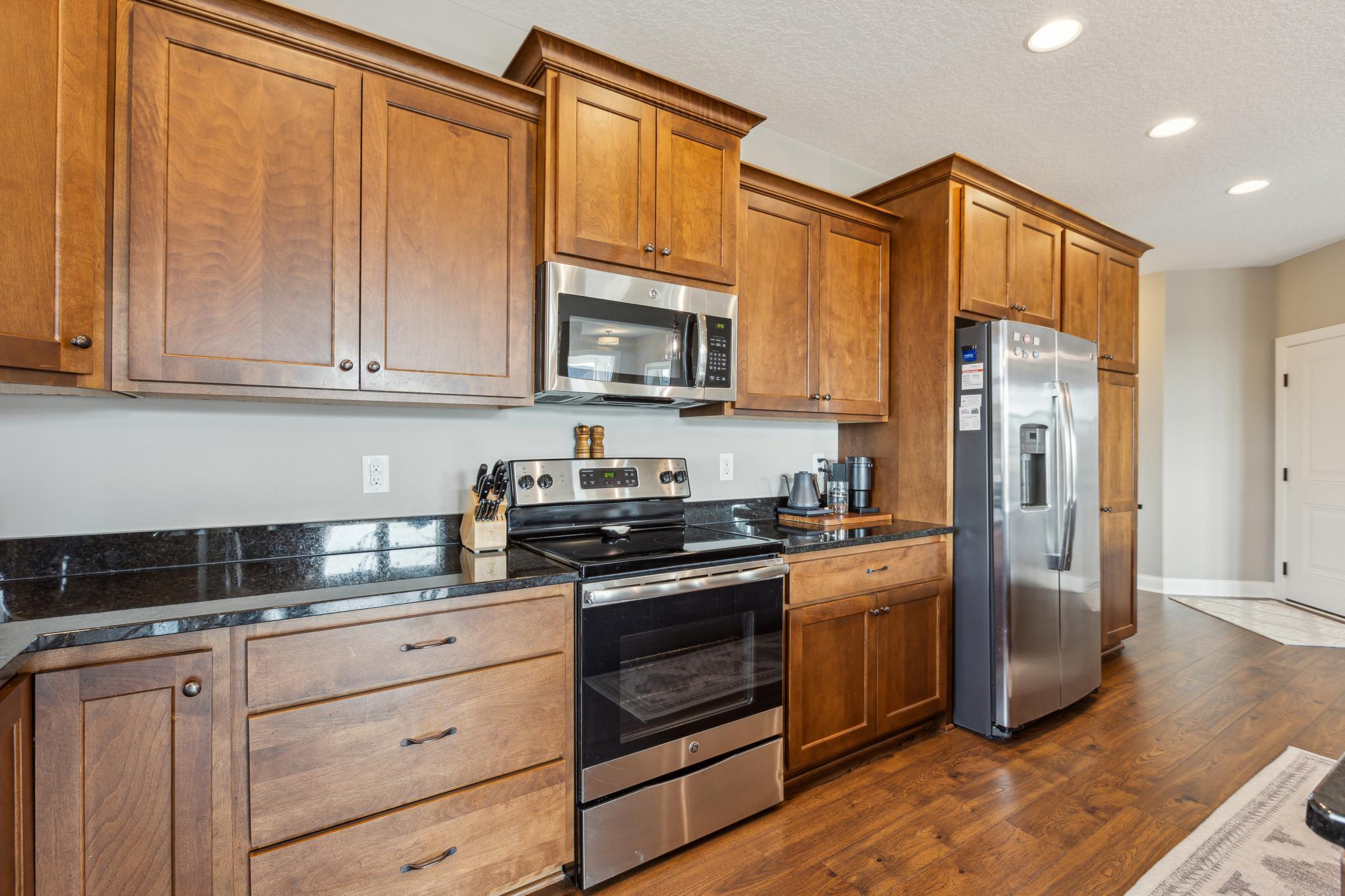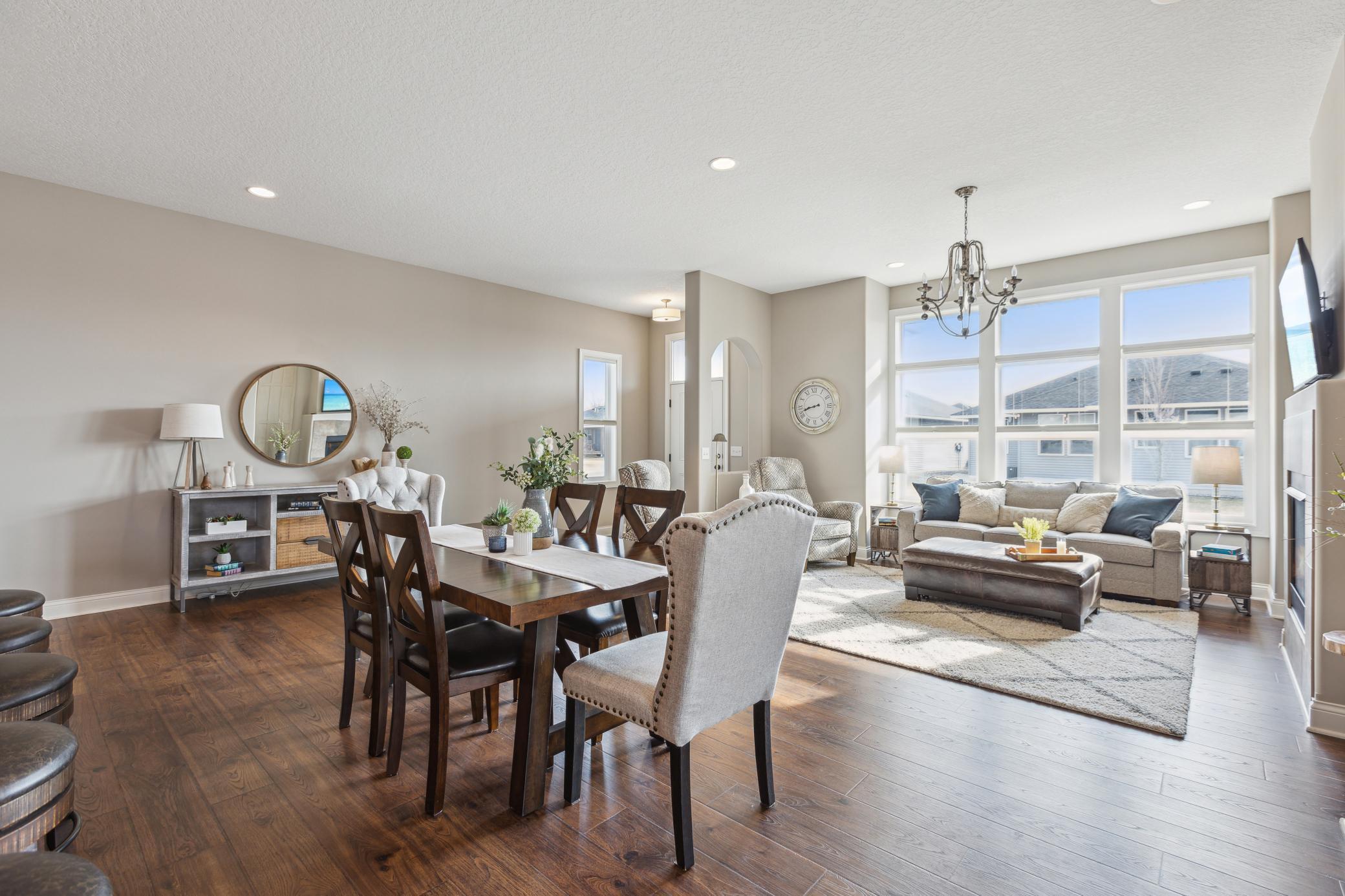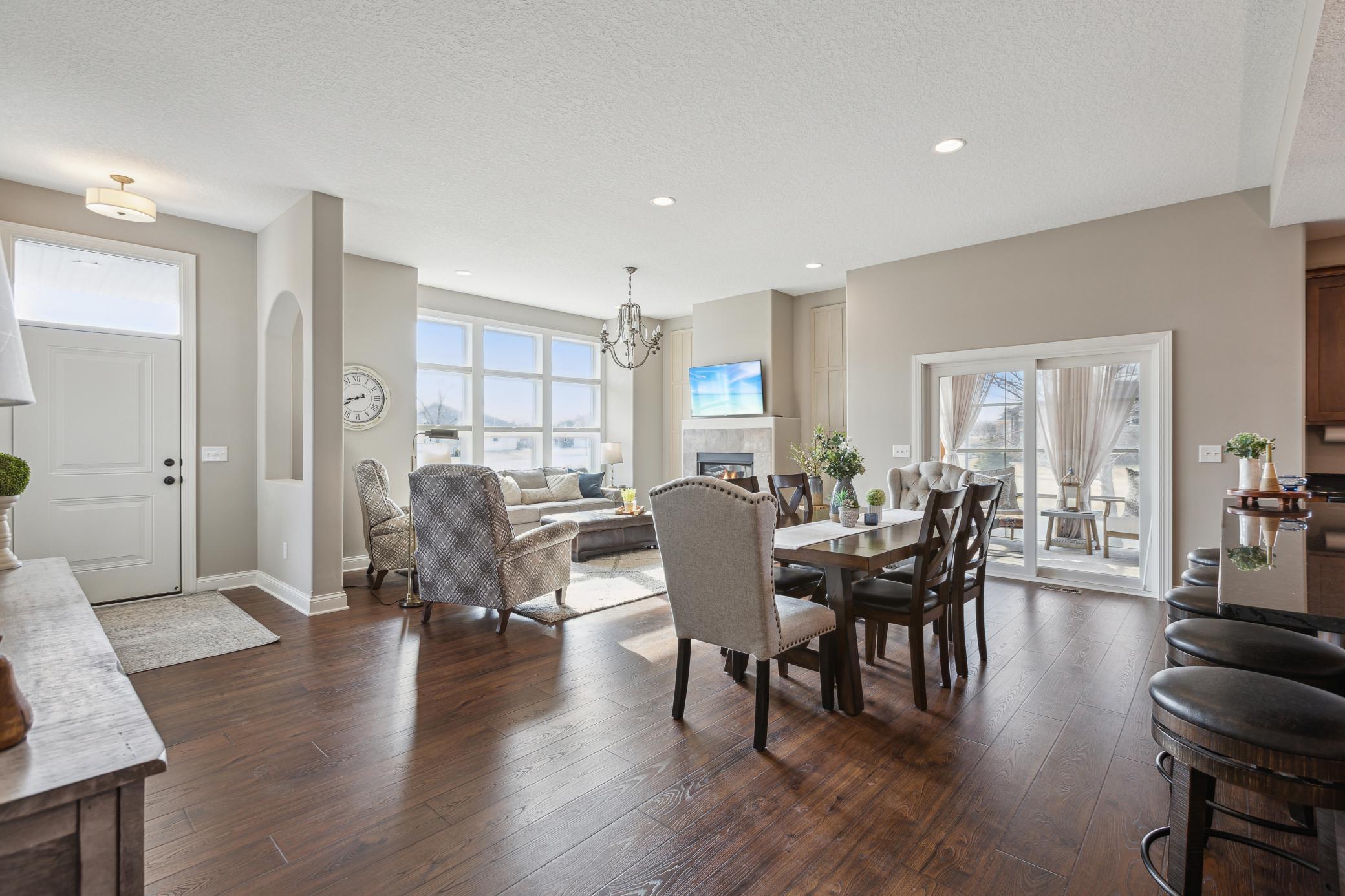 This beautifully designed home offers a stunning kitchen featuring granite countertops, stainless steel appliances, and a center island with a breakfast bar, perfect for entertaining. Walls of windows flood the open-concept living space with natural light, while the cozy fireplace in the living room creates a warm and inviting atmosphere.
